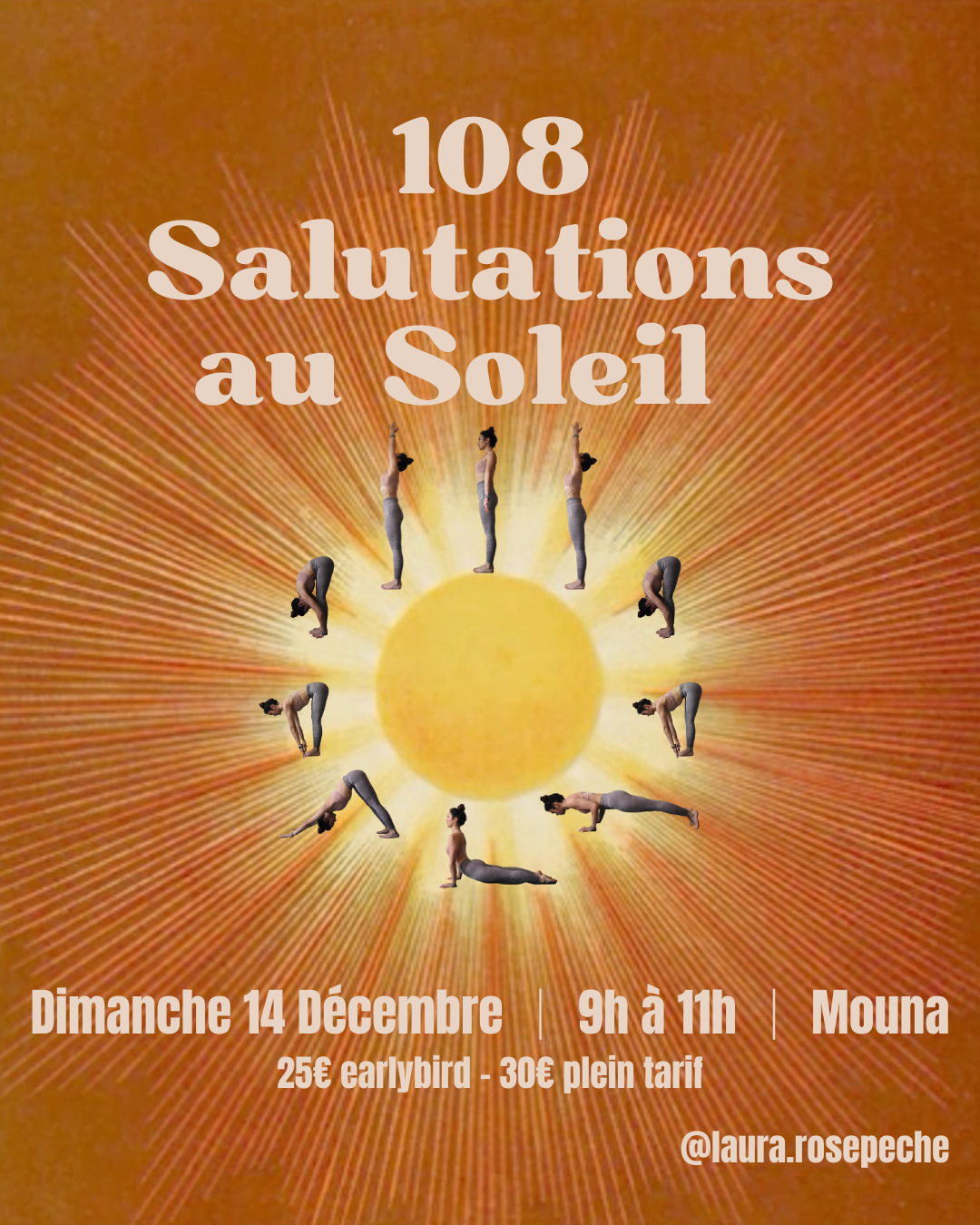 Tu veux purifier ton corps, apaiser ton mental et retrouver de l’énergie avant les fêtes ? Le rituel des 108 Salutations permet de traverser la saison en célébrant le solstice d’hiver et la lumière qui renait. Ce rituel c’est bien plus qu’un challenge physique, c’est une méditation en mouvement. Tu découvriras une force que tu ne soupçonnais pas. Tu nous rejoins ?